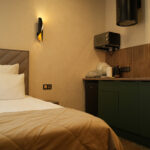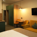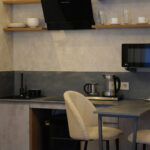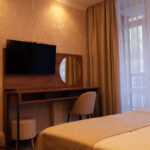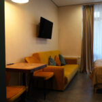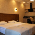 Апартамент категории «Стандарт комфорт» — это стильное и уютное пространство в нейтральных тонах. Просторная кровать и удобный диван обеспечивают комфортный отдых, а функциональная кухня позволяет с удобством готовить. С балкона номера открывается живописный вид на горы.