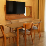 Апартаменты категории «Студия» предлагают интегрированное пространство гостиной со столом, кухней и зоной для отдыха. В апартаментах установлена большая кровать и раскладной диван, что позволяет комфортно разместиться гостям. Вдохновляющие виды из панорамных окон на окружающую природу подарят вам спокойствие и уединение, а кухня оснащенная необходимой бытовой техникой, позволит чувствовать себя как дома.